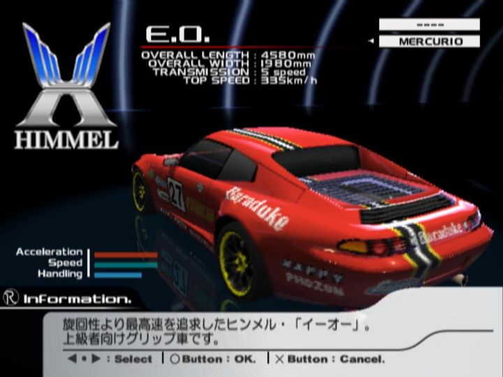 | Ridge Racer Wiki says a Turbo Flat 6, and Himmel is a German manufacturer, so this is definitely a Porsche 911 Turbo. 5-Speed Manual gearbox matches the 964 generation, too. -- Last edit: 2017-06-09 19:17:34 | |