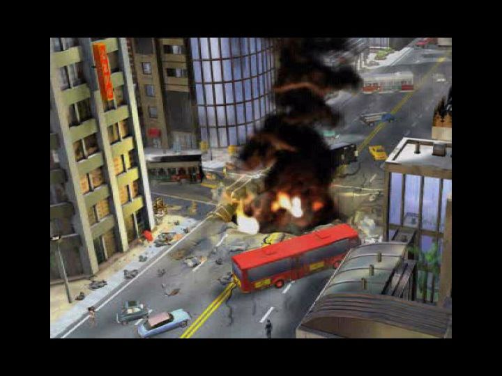 | Vanhool A500, a blue one appears in SimCity 4. I noticed that a few of the vehicles in this shot are 3D versions of the in-game vehicles (the yellow car, small blue truck and the bus in the background) - if they appear anywhere else during the CGI cut scene, it may be helpful for identifying them... |