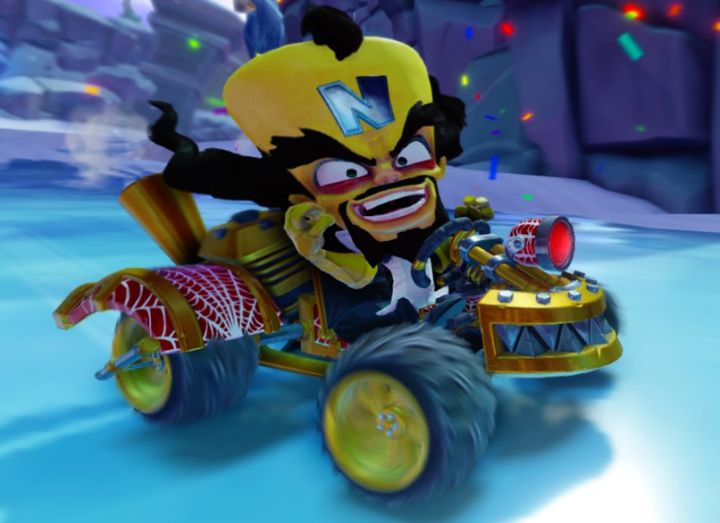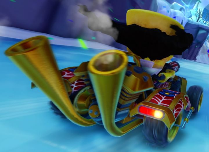 Team Cortex kart from Crash Nitro Kart. In CNK, these karts had handlebars instead of steering wheels, going for a 4-wheeled chopper-bike aesthetic.