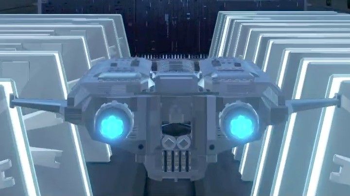 | This is supposed to be the ship that appears during Rey's vision in the film (which would later be named as the Bestoon Legacy in Episode IX), but they've improvised on the design because you only see a far shot of the ship from behind during Episode VII. It appears during the main story in the cutscene for that scene, but I think it only appears if you own the DLC, as most clips of that scene I could find on Youtube just show Lego Rey looking at the empty sky. |