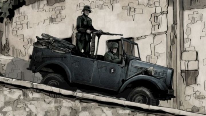 Given the context clues of the soldiers helmets and the jagged S, these are a pair of Nazis and thus the motor would be german rather than Russian.
