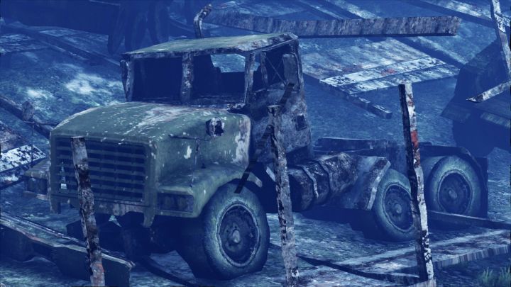 | towards the east from the humane labs facility. Its not that far out from the labs, but the military vehicles are scattered all over underwater. The most accurate description is to aim for the cliff face while underwater while still heading east. There is one barracks semi hanging over the edge, and another (the one in the image) not far below it. Link to video, shows location better: www.youtube.com/watch?v=kjLYeKKhtO4 | |